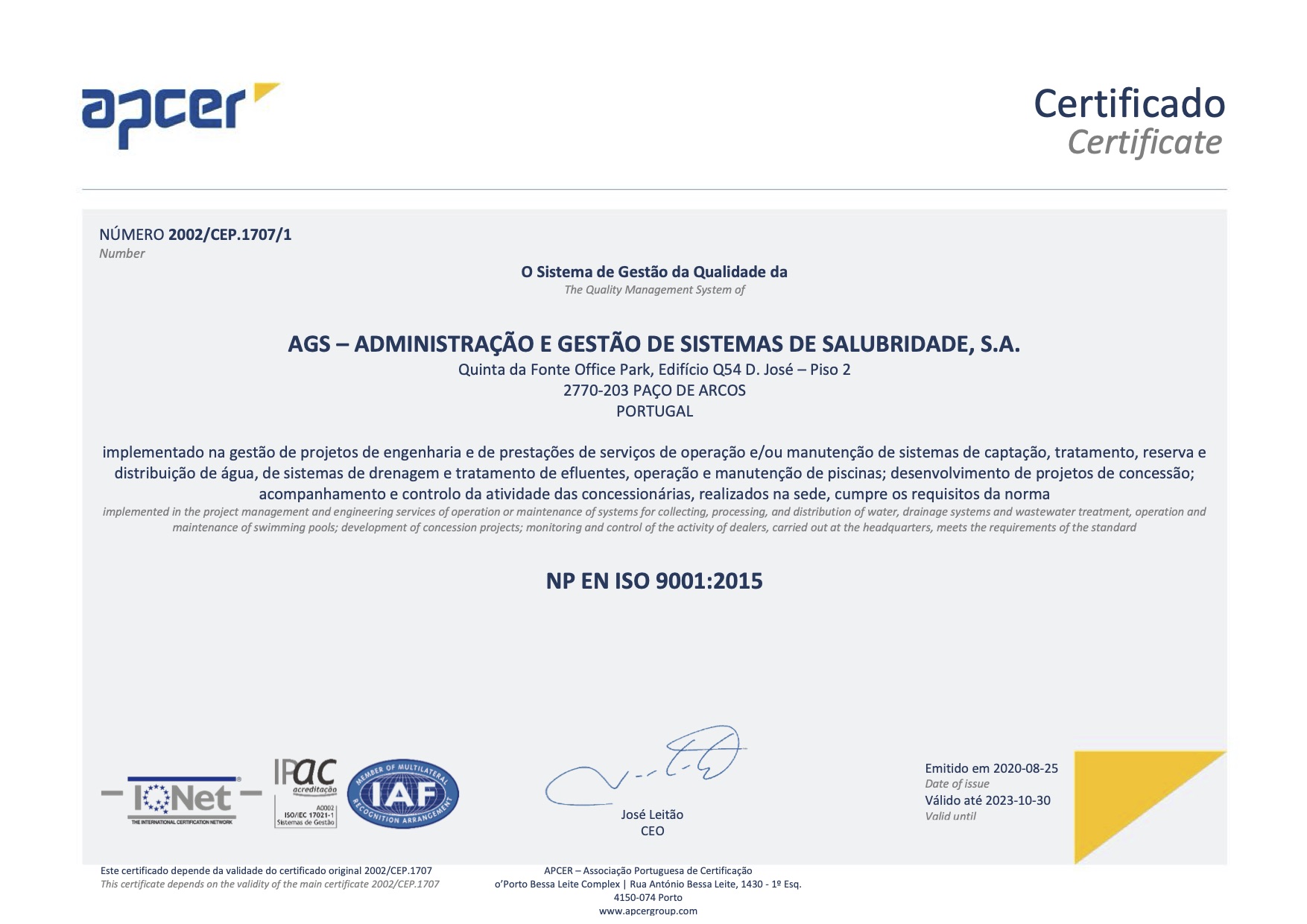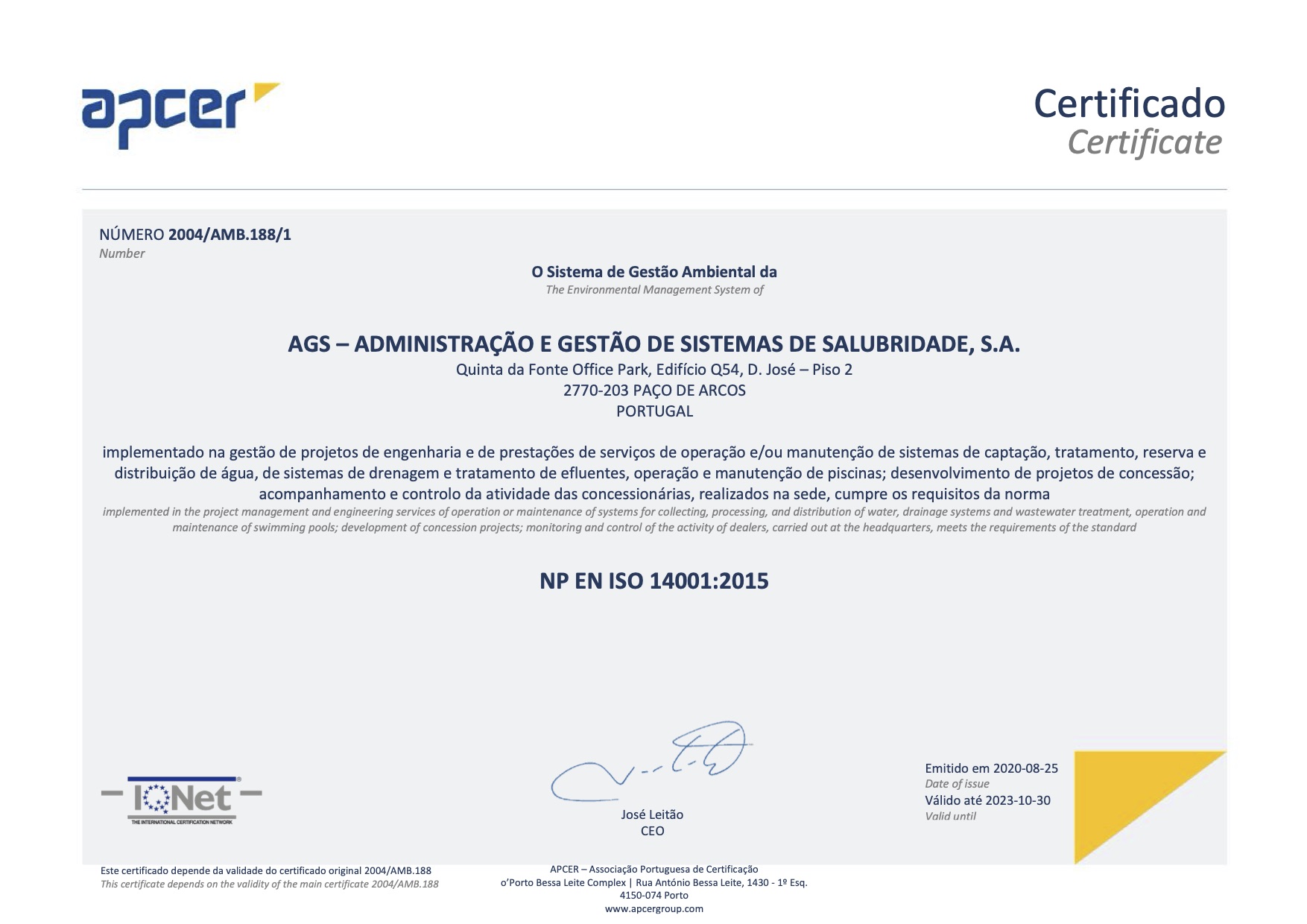 The certification of AGS for the management of operation and maintenance of water and wastewater infrastructures, through Concessions, institutionalised Public-Private Partnerships or Service Provision, was a pioneering focus in the water sector, resulting in consolidated benefits for clients, for AGS and for society in general in the years that followed.